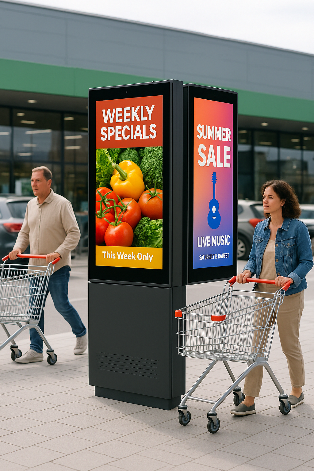 This double-sided outdoor display is ideal for supermarkets looking to capture customer attention from every direction. With bright, high-visibility screens, it showcases weekly deals, seasonal promotions, safety messages, or store information — all while customers enter or leave the store.