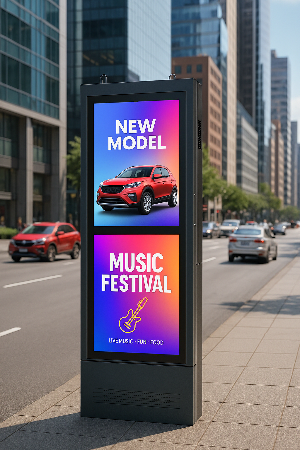 This double-sided outdoor display is built for maximum visibility along busy roadways. Its ultra-bright screens ensure advertisements, traffic updates, or public information remain readable even in direct sunlight and at high viewing distances.
