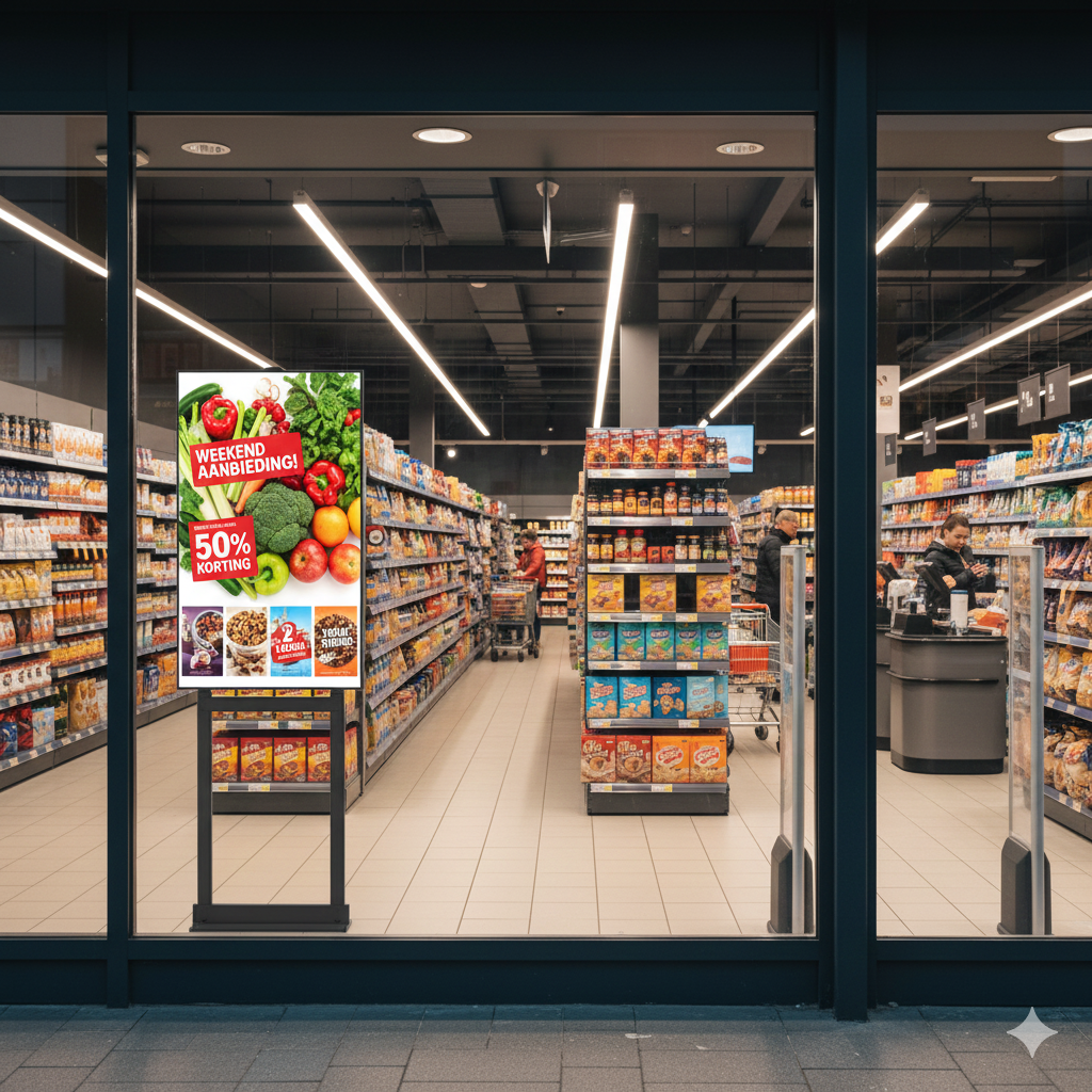 This high-brightness window display is the ideal solution for supermarkets looking to highlight weekly deals, fresh promotions, or seasonal offers right at the storefront. Positioned at ground level, it captures the attention of passing shoppers and encourages walk-ins with bold, vibrant visuals.